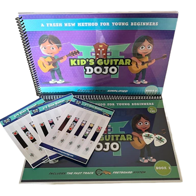 Kids Guitar Dojo offers a fun, gamified learning experience with badges, certificates, and a point system to motivate kids. Our Fast Track Fretboard System features colorful markers that help young learners navigate the guitar, supporting motor skill development and confidence. The markers, which fit various guitar sizes, can be removed as students progress. Additionally, our program includes fun quizzes and an e-book for offline practice, making learning engaging and rewarding.
