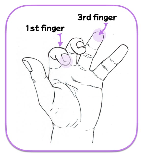 Check out the diagram below, this is an overhead shot looking down at your guitar. The 3rd finger is pressing down on the 1st E string or the skinniest string. The thumb is positioned in the middle of the neck so that your fingers can curl over like a cats claw. This makes it easier to for your fingertips to press down onto the strings